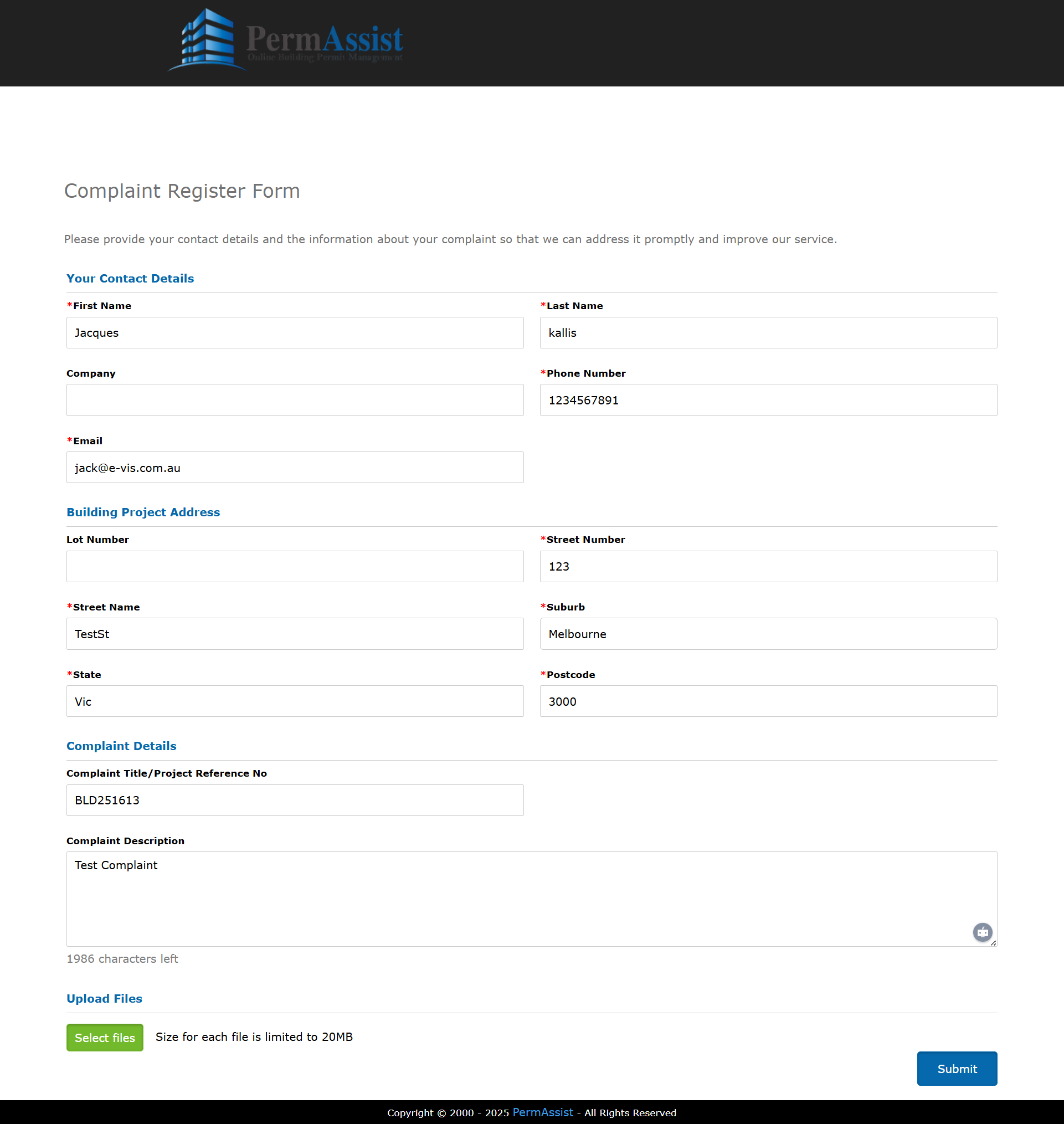 PermAssist provides a dedicated web page for the Complaint Register, allowing users to lodge complaints against specific applications. You will be provided customized link with your logo.